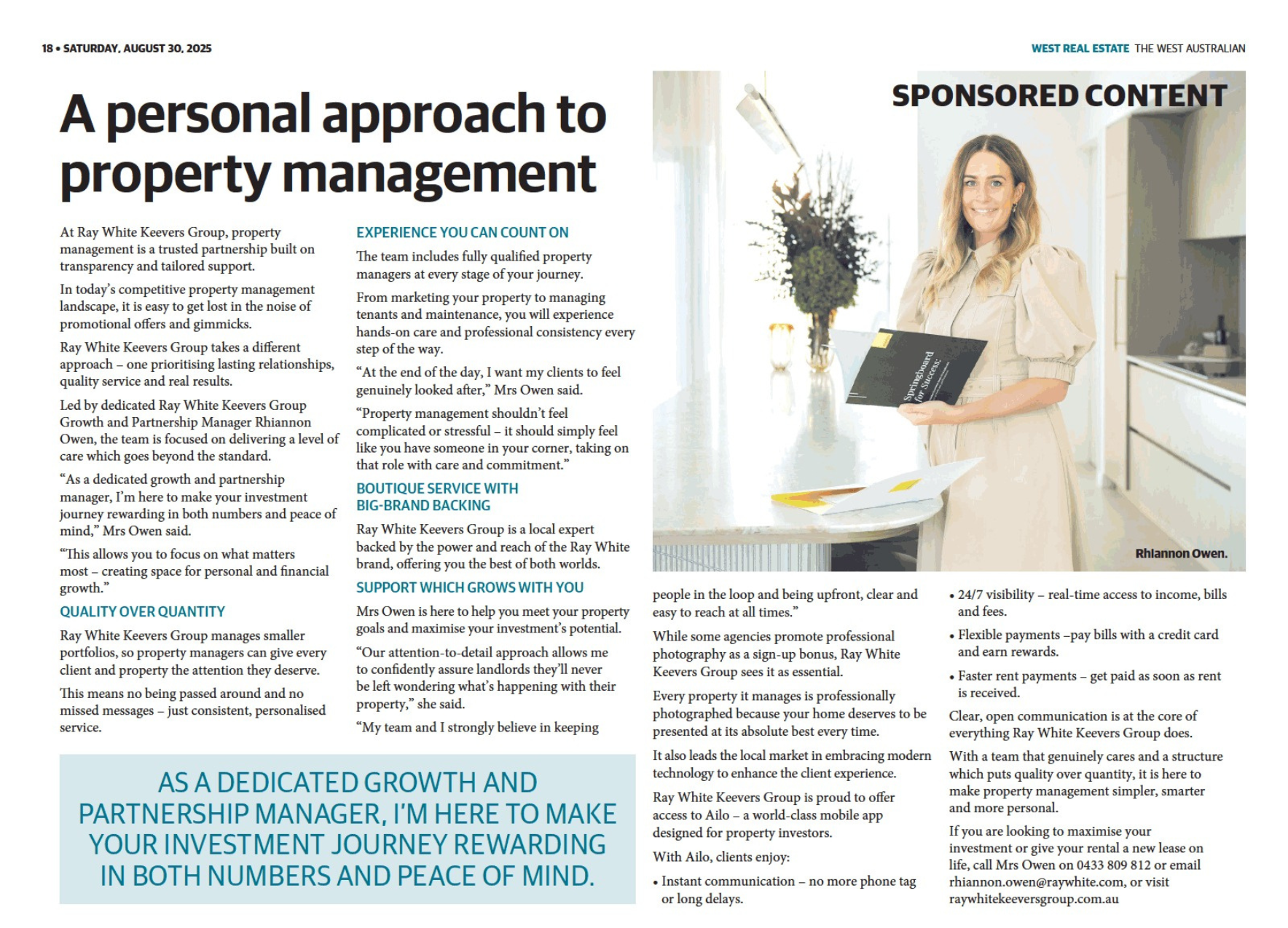 Published in The Weekend West – Real Estate on the 31st of August 2025. Our very own Rhiannon Owen discussing our unique approach to property management. Read the full article here.