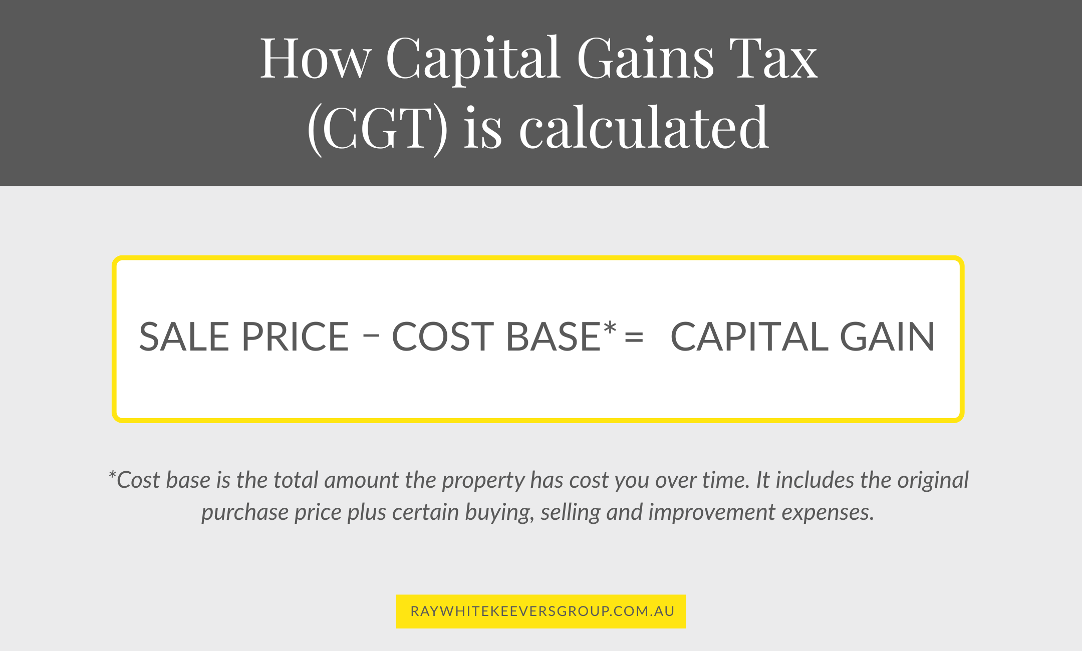 *Cost base is the total amount the property has cost you over time. It includes the original purchase price plus certain buying, selling and improvement expenses.
